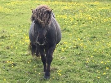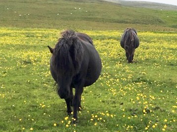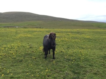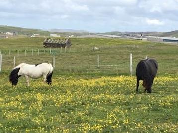 The Shetland girls are both in Sandness, four miles down the road, happily sharing a field with two of Bjørn’s Shetland ponies. They are all checked regularly.