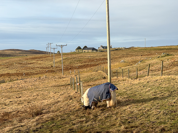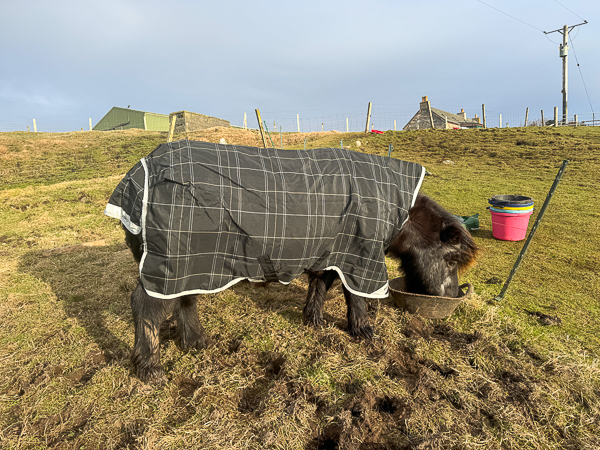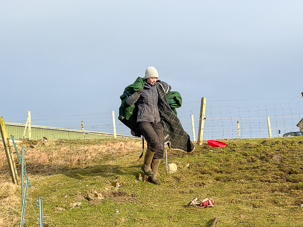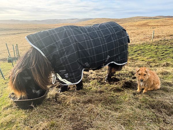 Then Flossie came down the hill carrying the Icelandic horses’ rain-sheets. Nothing is easy to carry in our world.