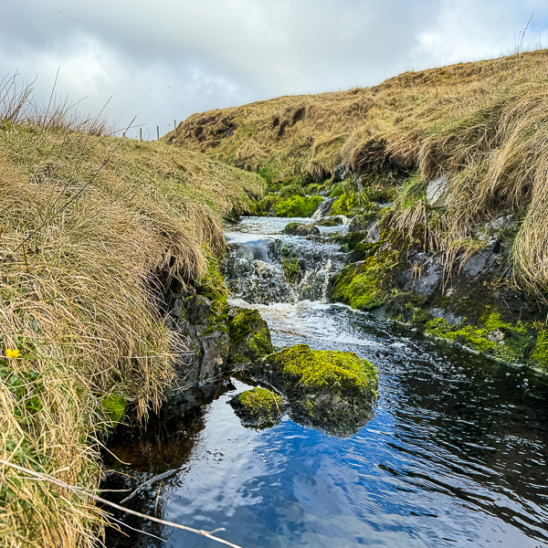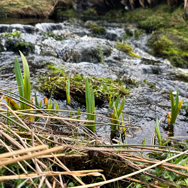 The green leaves by the burn (stream) will soon turn into yellow flag irises, which grow wild all over Shetland – they are known locally as “seggies”.