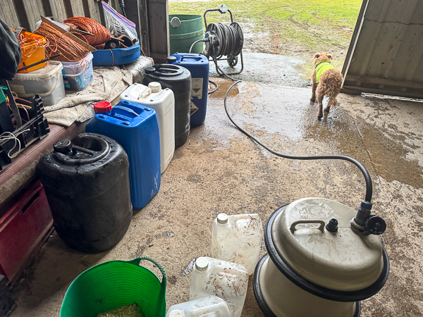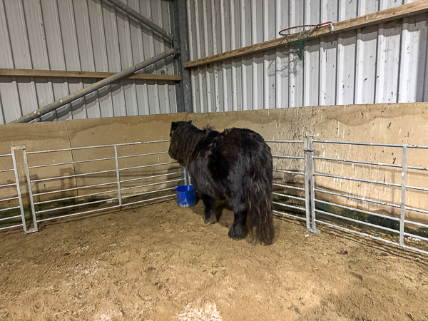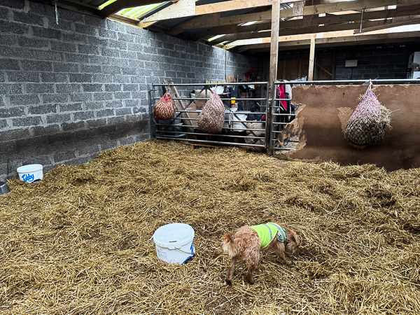 The sheep have haynets hanging, a lick bucket available and fresh water too. I even cleaned out their feed bowls just because.