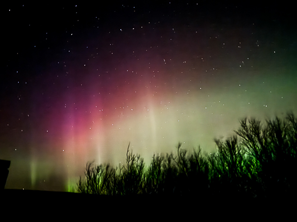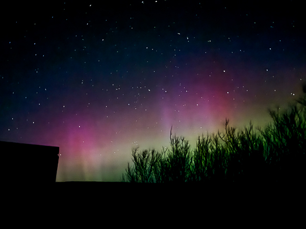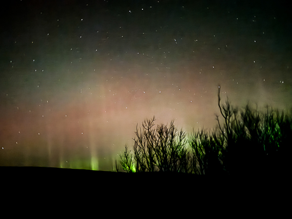 And then the sky really kicked-off. I ran outside with my phone and took as many photos as I could manage (it was cold and windy) standing from my best vantage point – the compost heap (or Northern Lights Observational Point, as my OH likes to optimistically call it). A spade is a spade in my language.