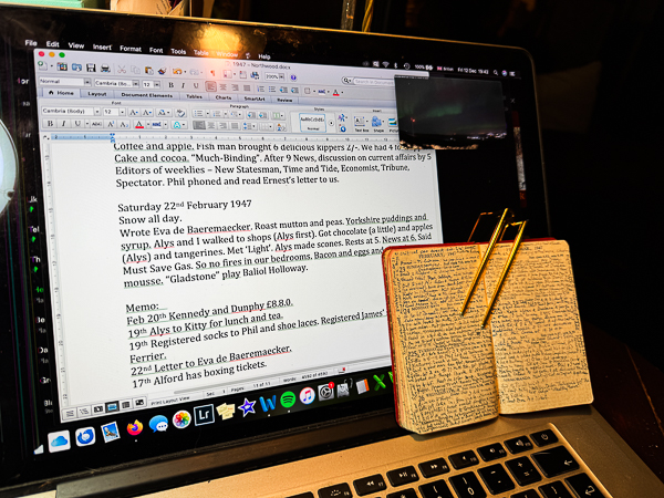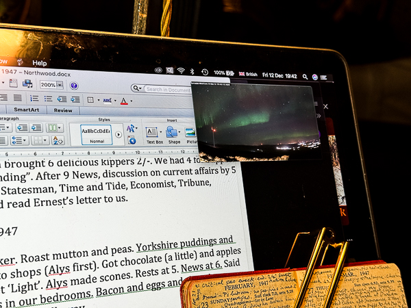 After supper, I checked outside, saw nothing much (I may be a bit blasé about Northern Lights these days – they’ve got to be pretty spectactular to make me leave my supper or a warm room) and went to my desk in the sitting-room to transcribe my Great Great Aunt Kate’s diaries. I’ve reached February 1947. I like to get two weeks done every night and it is not easy – the writing has not got any bigger.