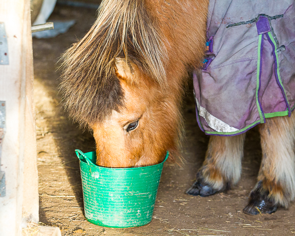 I gave Iacs a bucket of hay replacer, because it is easy to eat and I had it ready. Iacs stuffed his fat floofy face not even coming up for air. I also put his rug on.