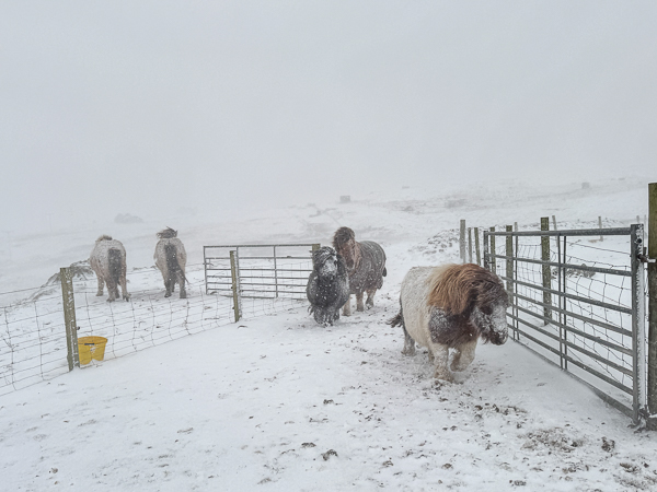 Not even two hours later, we had a huge blizzard. It was vile. So Flossie opened the big shed doors, and I opened the gate. All the horses and ponies came in as fast as they could.