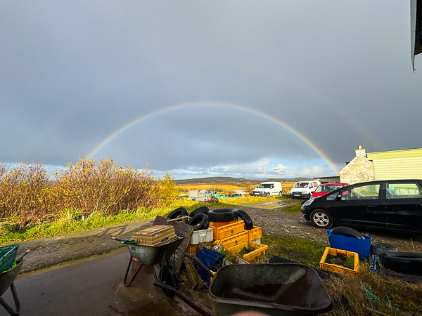 Off to work at Turriefield packing veg and the rain poured down outside. But a good almost double rainbow, though.