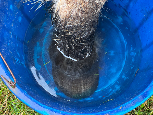 While we waited for the vet, OH and I soaked Haakon’s hoof to see if that helped.