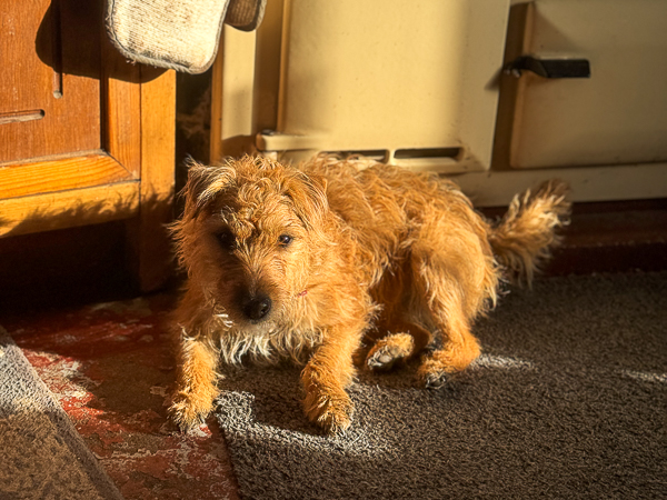 I do however come downstairs for meals and this was at breakfast when Flossie and OH had come indoors having finished doing the animals (rugs off today for all as it is a nice day).