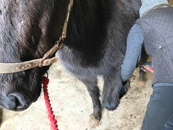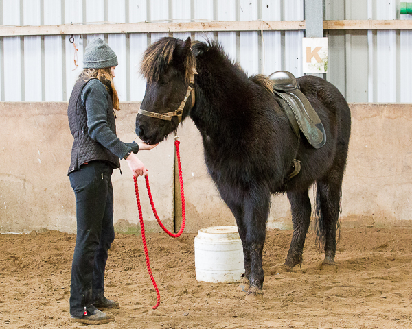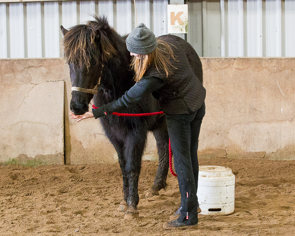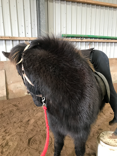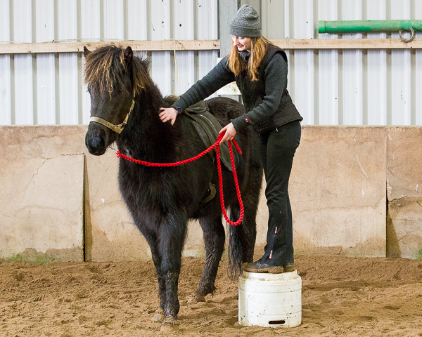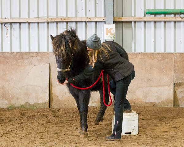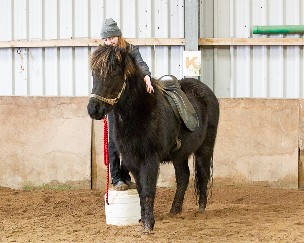 Daisy stands on bucket and leans over Dreki’s back. Feet off the bucket so he has all her weight.