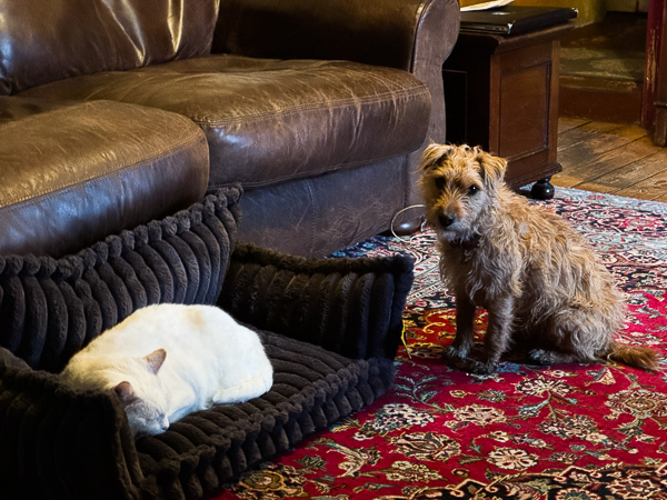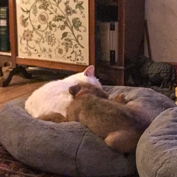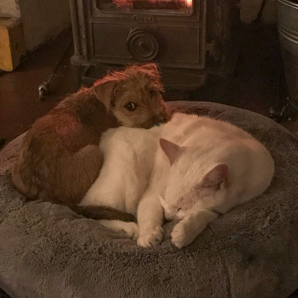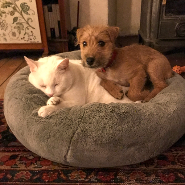 And Daisy said oh, but they did share a bed. No, I replied, I never saw that – I had been away during Pepper’s formative years looking after my mother while Daisy and OH were on puppy and cat (plus ponies/horses/ducks/hens/sheep) duty. So I missed all this which was horrid but just one of those things. I was needed elsewhere. Luckily, Daisy had photographic evidence which is very important for any wild claim.