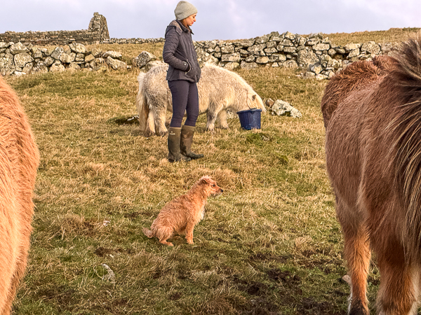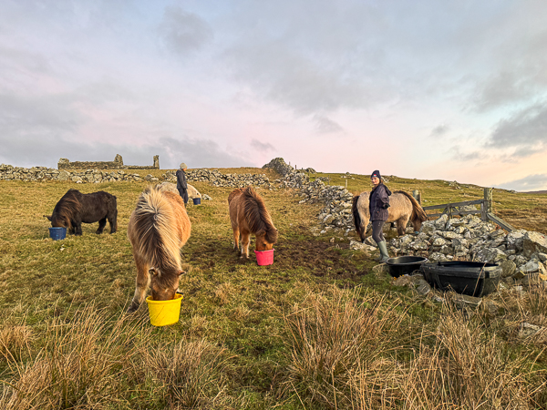 Next, it was time for the old horses and ponies – we each grabbed a bucket of food and off we went across the hill. It is so nice having all this help.