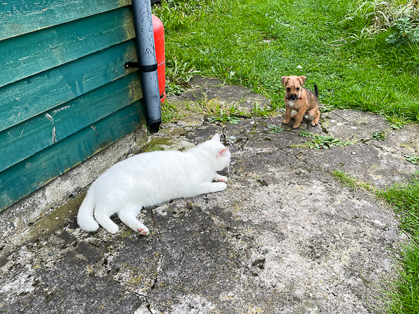 Little Herself (today possibly named Pepper, as in Chilli Pepper) has spent the morning with Flossie while the farrier was here. Puppies and horses don’t mix. Not never.