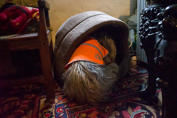 BeAnne was not very helpful.  She has an aversion to being photographed and, no, she doesn’t even remotely fit into Monster’s bed but she gave it her best.