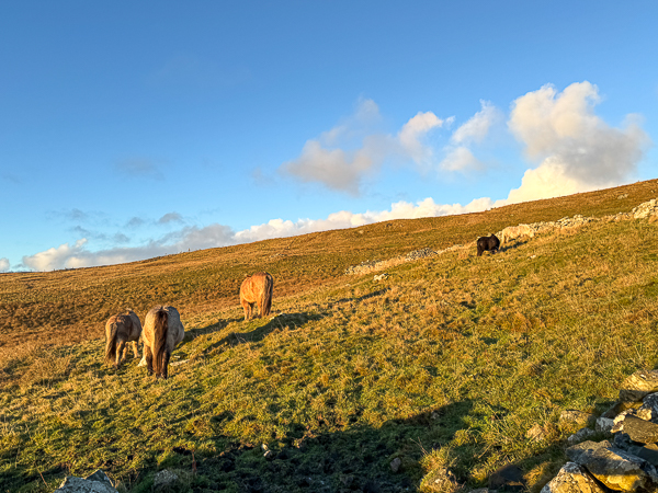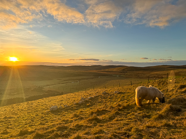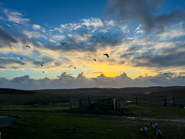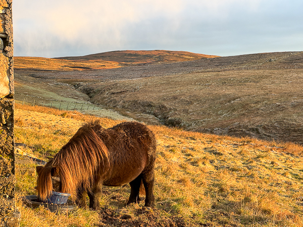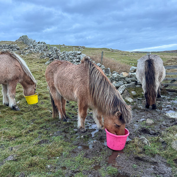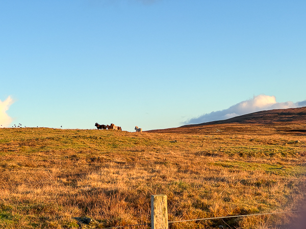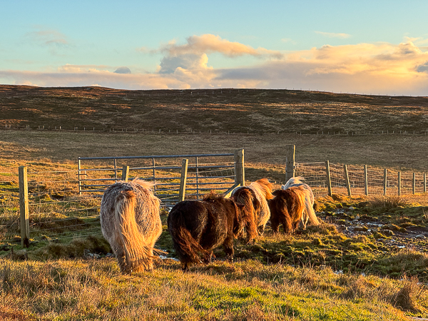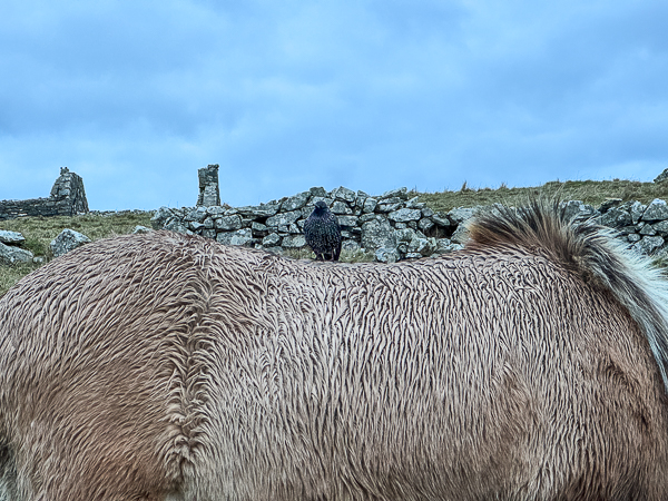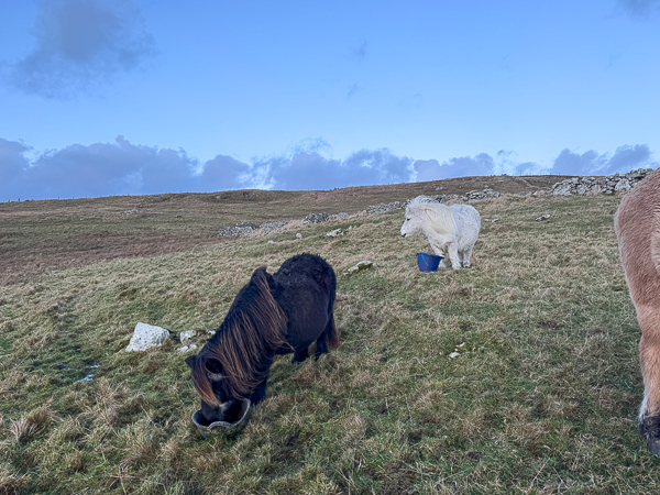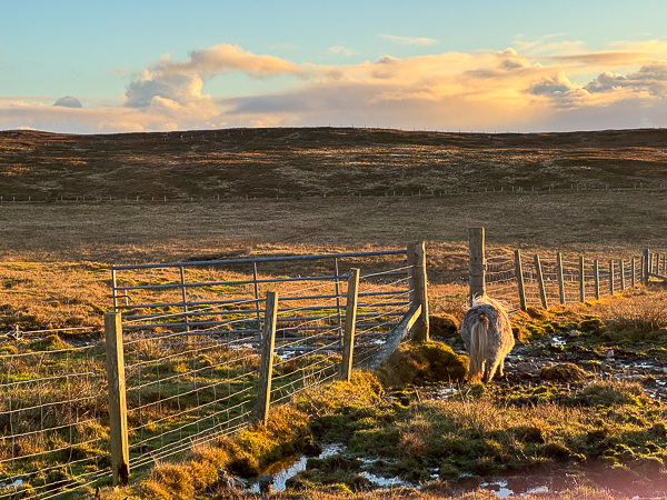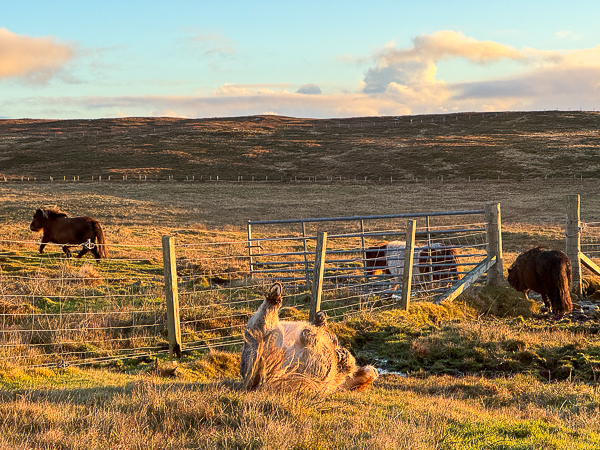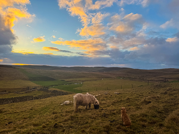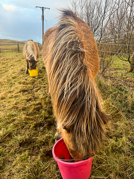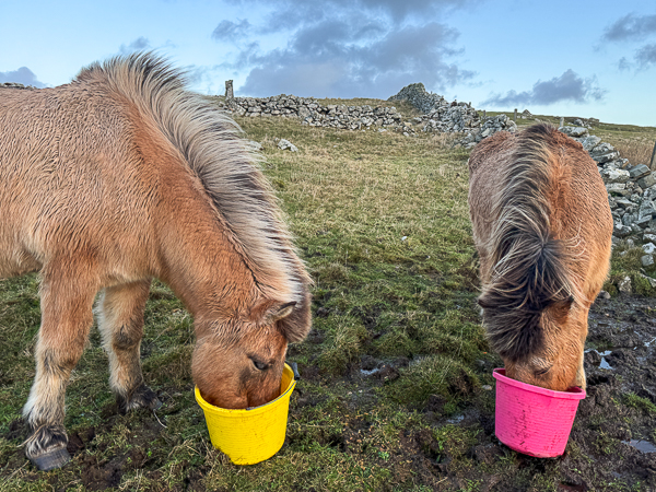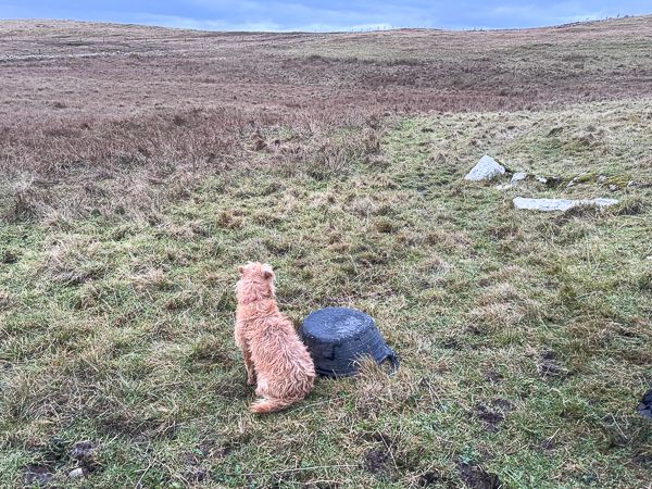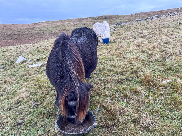 Later, on the dog walk, I found Maggie who was in the wrong field (just why?) I brought her home and she very gratefully rejoined the others. Dahlia and Gussie were at the furthest point of the field possibly gazing at a newly arrived hill-ram. I gave them the breakfast I had brought so I knew they were moving and eating fine. Oh, yes and then it started to rain and I got home totally soaked through to the skin.