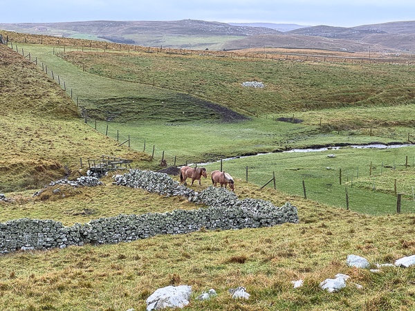While I fed the others at the top of the field, Haakon was still struggling to walk, so I broke the habit of a lifetime and took his breakfast bucket to him. I walked him over the stream and then I put his bucket down so he had to eat with his hooves in the running water.