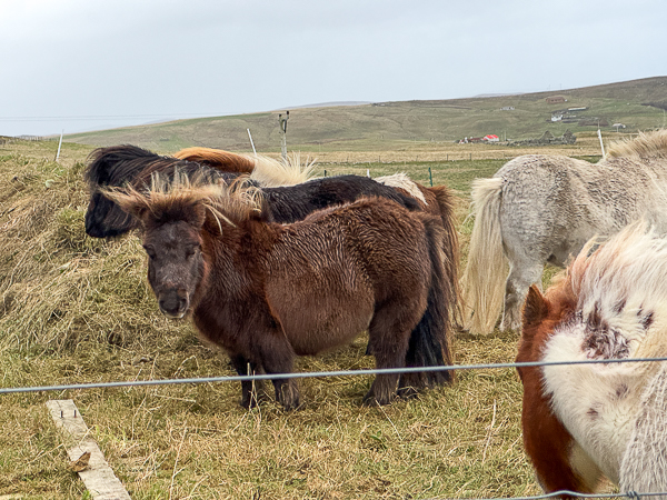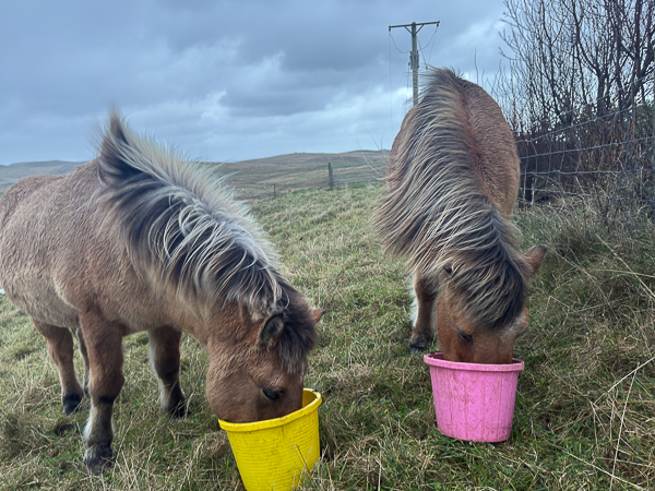 When I went back outside the ponies had come closer and were now asking for their breakfast, which I luckily had with me, so they ate it and bounced off again. The weather is calming down now. I have run out of outdoor clothes. They are all soaked through.