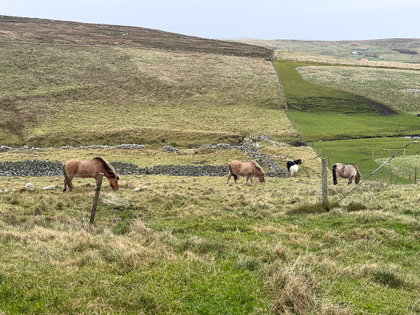 I couldn’t see the Shetland ponies either and it was certainly no weather to go looking in. Later on in the morning, I spied them huddling by a dry-stone wall and Dahlia and Gussie were close by too.