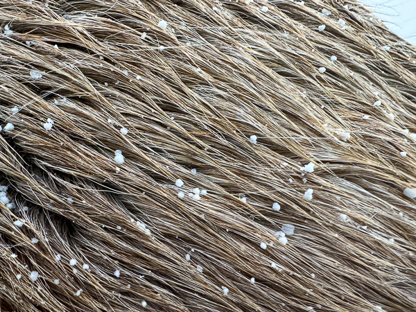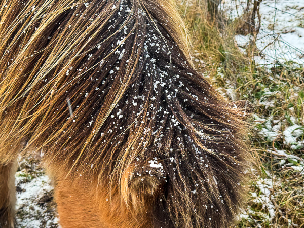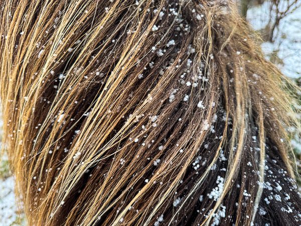While the horses/ponies were eating I examined Kolka’s coat and noticed that their winter coats are doing their job – the guard hairs are working.