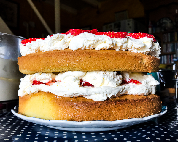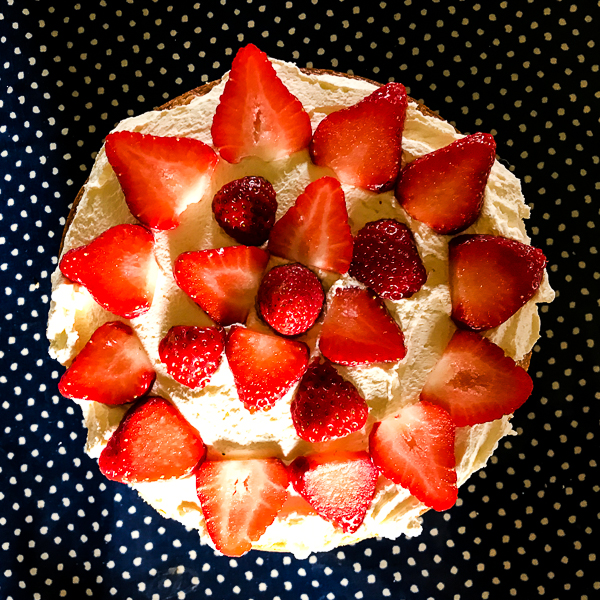 I am not a huge cake-maker. It is a rare event at best but once in a blue moon, I feel the urge and today, I created this creation.  My strawberries-and-cream cake.