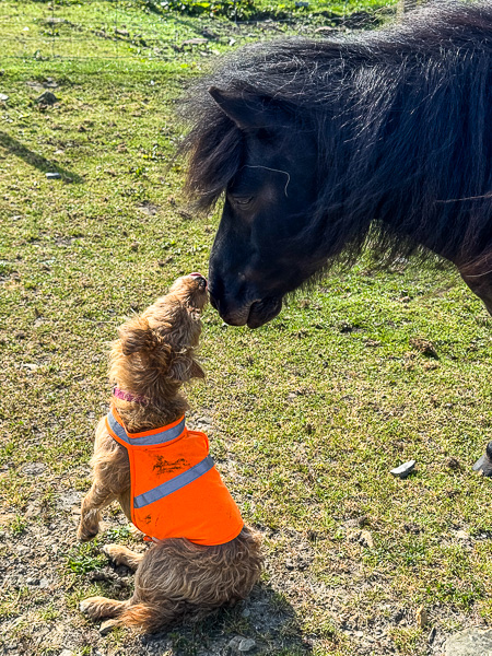 I was waiting for Monika’s arrival with her equine weighing scales but soon realised I had misread her arrival time so I busied myself cleaning water buckets, brushing manes (again) and took these photos of Pepper with the ponies. So sweet. They genuinely like her and she goes out of her way to find and sit with them.